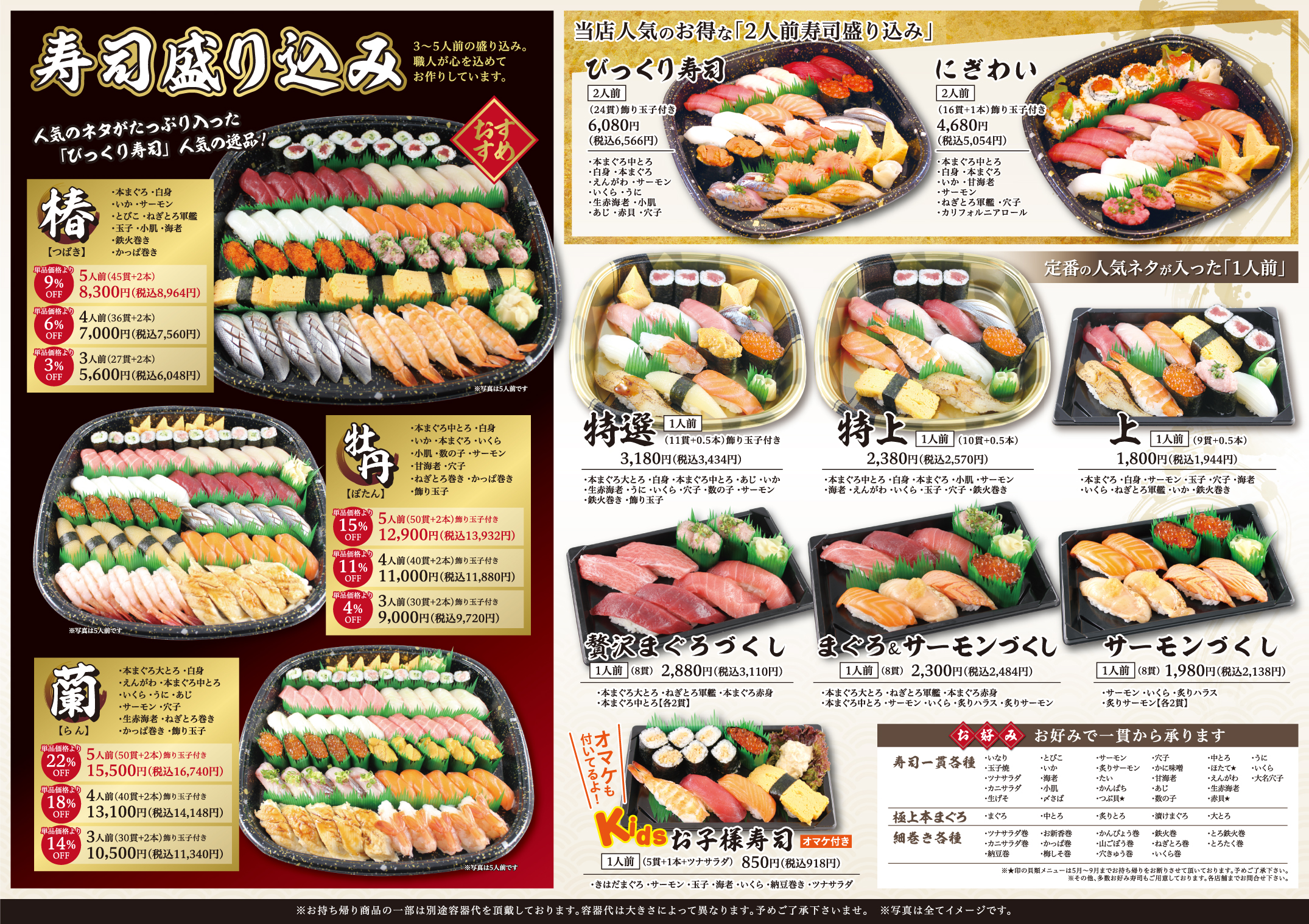 ・本まぐろ ・漬けまぐろ ・炙りサーモン ・サーモン ・かんぱち ・たい |